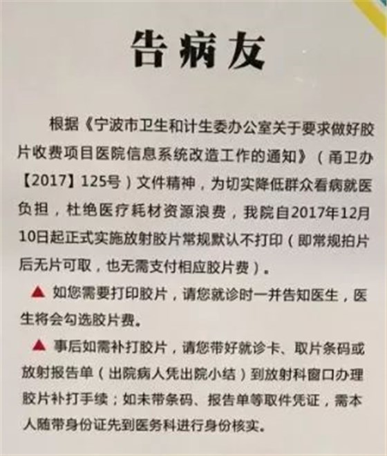 在此之前,浙江省寧波市北侖區(qū)人民醫(yī)就發(fā)布一則通知,核心內(nèi)容就一個:從2017年12月10日開始醫(yī)用膠片不再默認打印,病人也無需支付相應費用,如果外院會診或者涉及到第三方賠付需要膠片的自行到相關窗口繳費并補打。